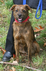 Rusty's got it nailed! Rusty (Rye) is a very sweet and playful 1 year old boy weighing about 18 pounds. He appears to be a spaniel mix. He has a beautiful soft brindle coat. He is living in a foster home with other dogs, and is always trying to get them to play with him. He loves running in the yard, chasing a ball, and will bring it back to you so you can throw it for him again. He loves to get his belly rubs and is quite affectionate. He is crate trained and settles down nicely at night when he goes in to sleep. Since he is a young pup, he will need some basic training -- but is a smart little guy and has already learned "sit". We are working on his leash walking. An active home would be good for him as he does love to run and play. He gets along with dogs - we do not know how he is with cats.