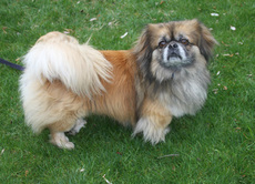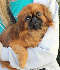 Rufus is an adorable pure breed Pekingese, about 5 years old and around 27 lbs. He is a little shy at first but warms up quickly. He is very sweet and friendly with all - good with people (including kids), other dogs and cats too. He is a very easy dog. He likes to go on his daily walks or explore in the yard, loves belly rubs and cuddling up on the couch with his foster mom. Rufus is housebroken too.