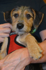 Raisin is adorable Wirehaired Terrier mix, about a year old and 20 lbs. He is a very sweet little fellow that loves attention. He loves to run and play with other dogs. He settled in easily with his new foster mom and family and will bond instantly to whoever shows him affection. His foster mom says his personality is like Tramp in Lady and the Tramp. The perfect love bug! Extremely friendly, loving and affectionate. A GREAT, GREAT dog. Housebroken too! Please fill out an adoption application.