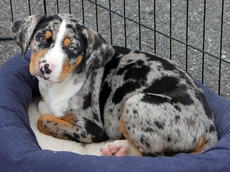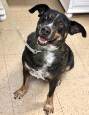 Meet Rufus! This ear-resistible pup is a 7 month old, 37-lb Catahoula Leopard Hound mix with the most spectacular markings. He is very good natured, very silly and friendly with all people. He is playful and friendly with other dogs too ... he likes to play then settles down nicely. He has a little puppy mischievousness which only adds to his charm. He walks well on leash, is housebroken, sleeps peacefully in his crate all night and is ready to greet each day with a big smile and a wagging tail. He is a pleasure to have around and will bring so much fun and joy to his family. Will that be yours? If you are interested in this dog, please submit an application directly to our website at www.ny-petrescue.org. Only applications submitted directly to Petrescue will be considered.