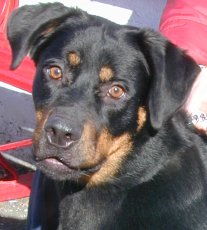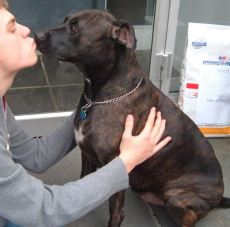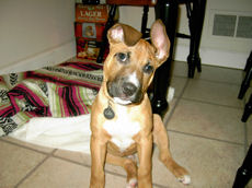 is a handsome fellow, about a year old and 58 lbs. He is still very much a puppy and loves to run & play. He needs some training since he does jump up and doesn't know his size but when he does jump up on you he literally gives you a big bear hug with his 2 front legs and a sweet kiss on the lips - what a fantastic companion. All he wants to do is please you; he is very sweet and affectionate. He knows some basic commmands like sit and is good with other dogs, although can be somewhat overpowering and exuberant. He loves people including kids. He is housebroken too. Thank you Susan Fox for sponsoring my ticket to freedom!