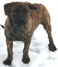 is a sweet dog, very gentle both with adults and children. He is about a year old and 38 lbs.