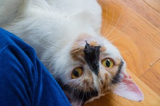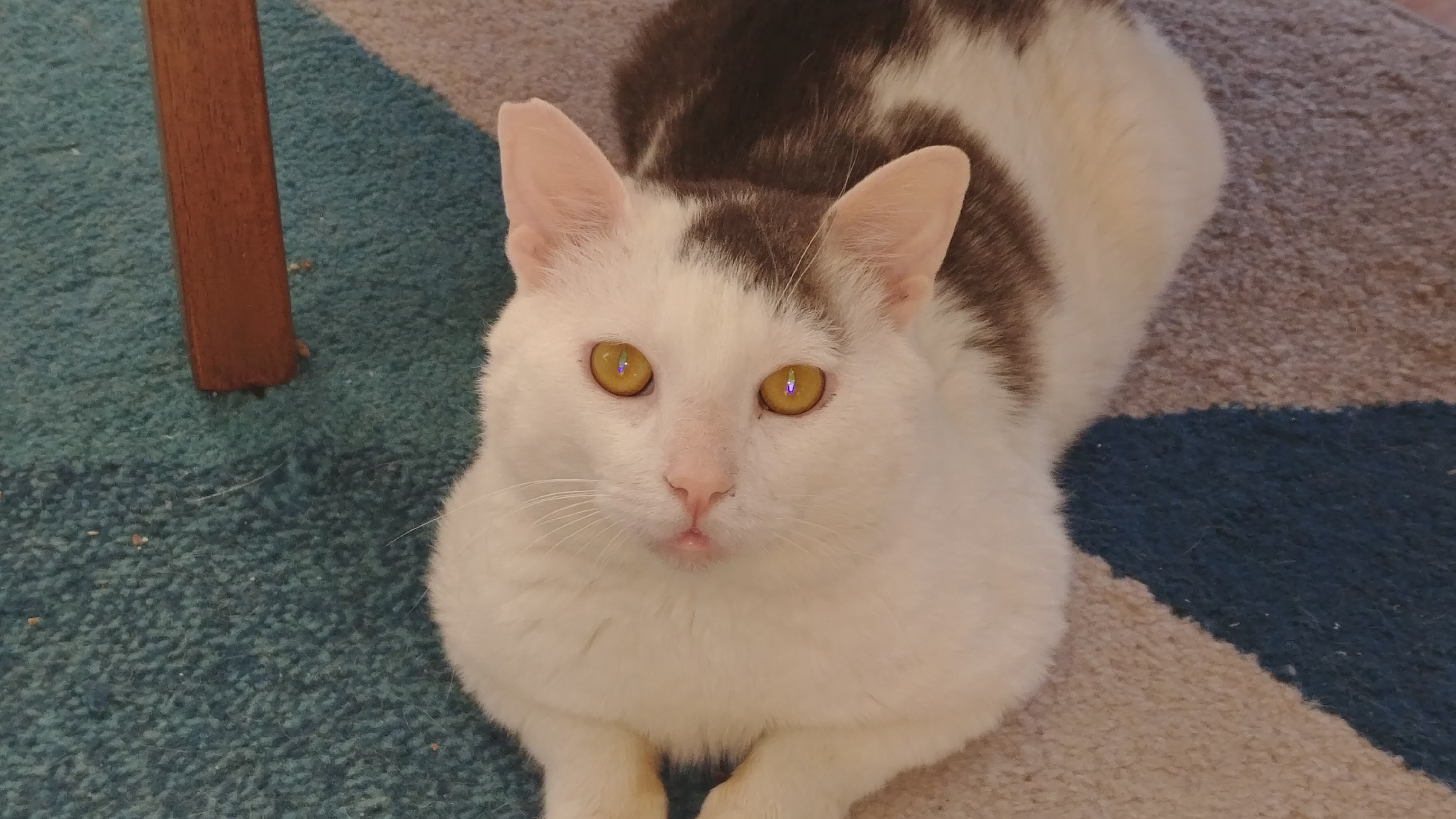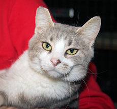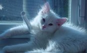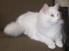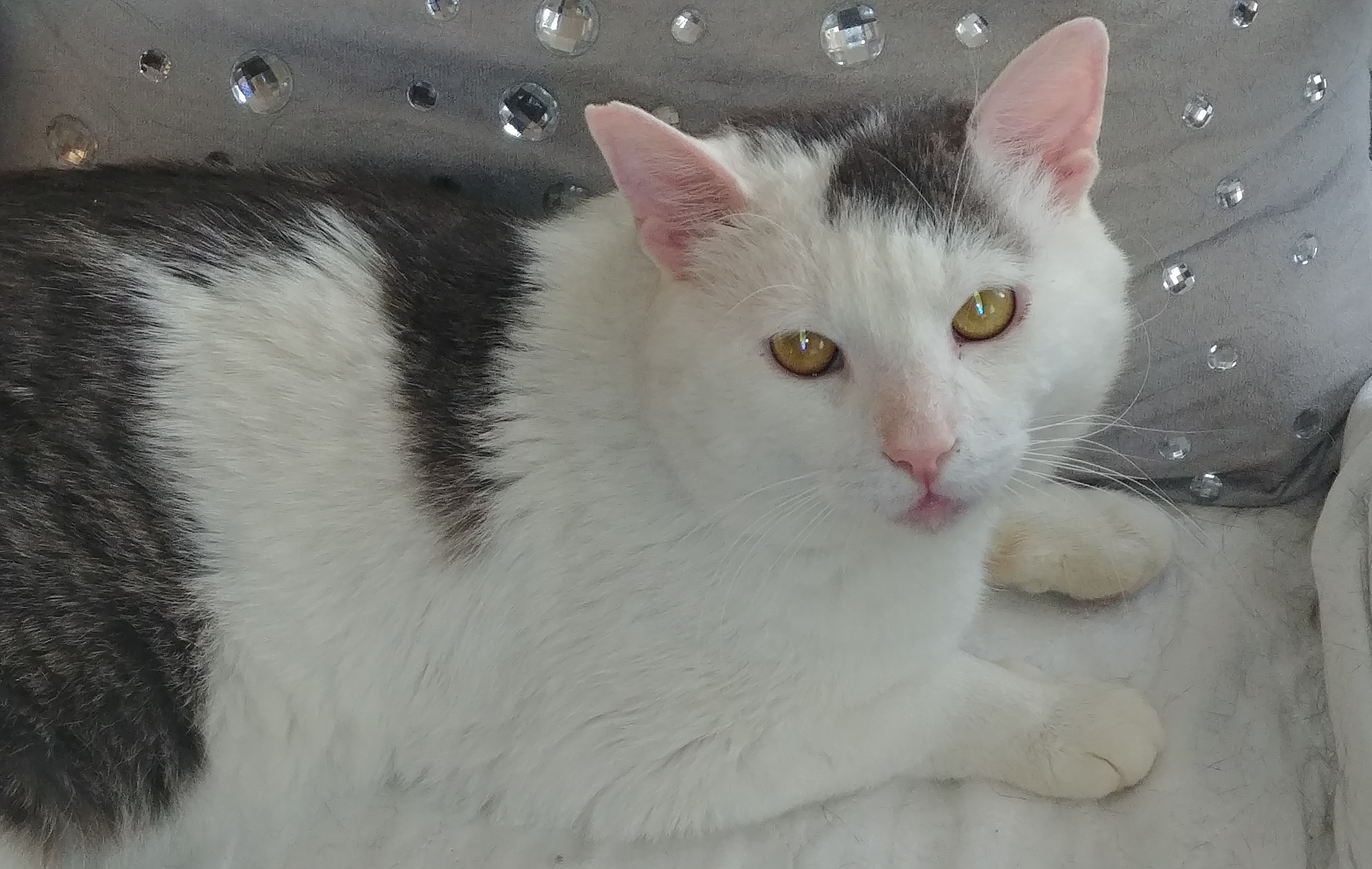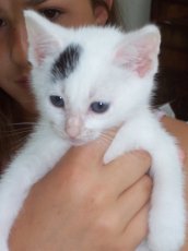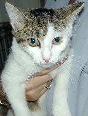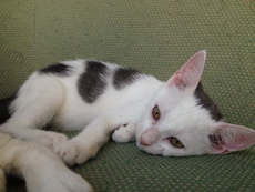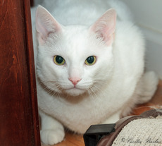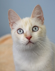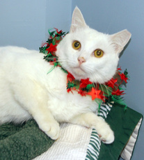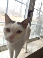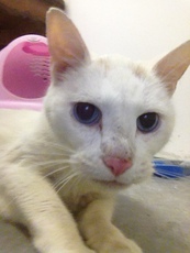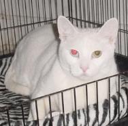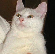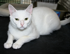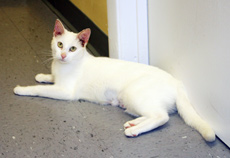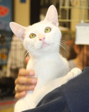 Sushi, pure white with yellow eyes, is not just a beauty, but is so friendly that she happily goes nose to nose with dogs. Sushi and her kittens were abandoned some time ago at a vet's office who turned the lovely cat over to Pet Rescue. This former Mom (long since spayed) is ready to make a lucky human very happy.