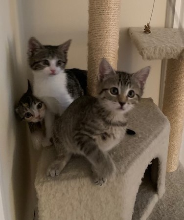 MISTIQUE AND GAMORA ADOPTED The Super Heroes are Mistique, Nova and Gamora - three 9-week old (as of 10-22-19) female kittens. Only Nova remains to be adopted. Nova (gray tabby - all gray and black with white chin) is a curious and affectionate little girl. She loves to poke around various hiding places and make them her playground. Then she’ll curl up in your arms for a cat nap. She’s very affectionate with her siblings, and will snuggle with them, or groom them, or come to the rescue if she hears a cry. (rm)