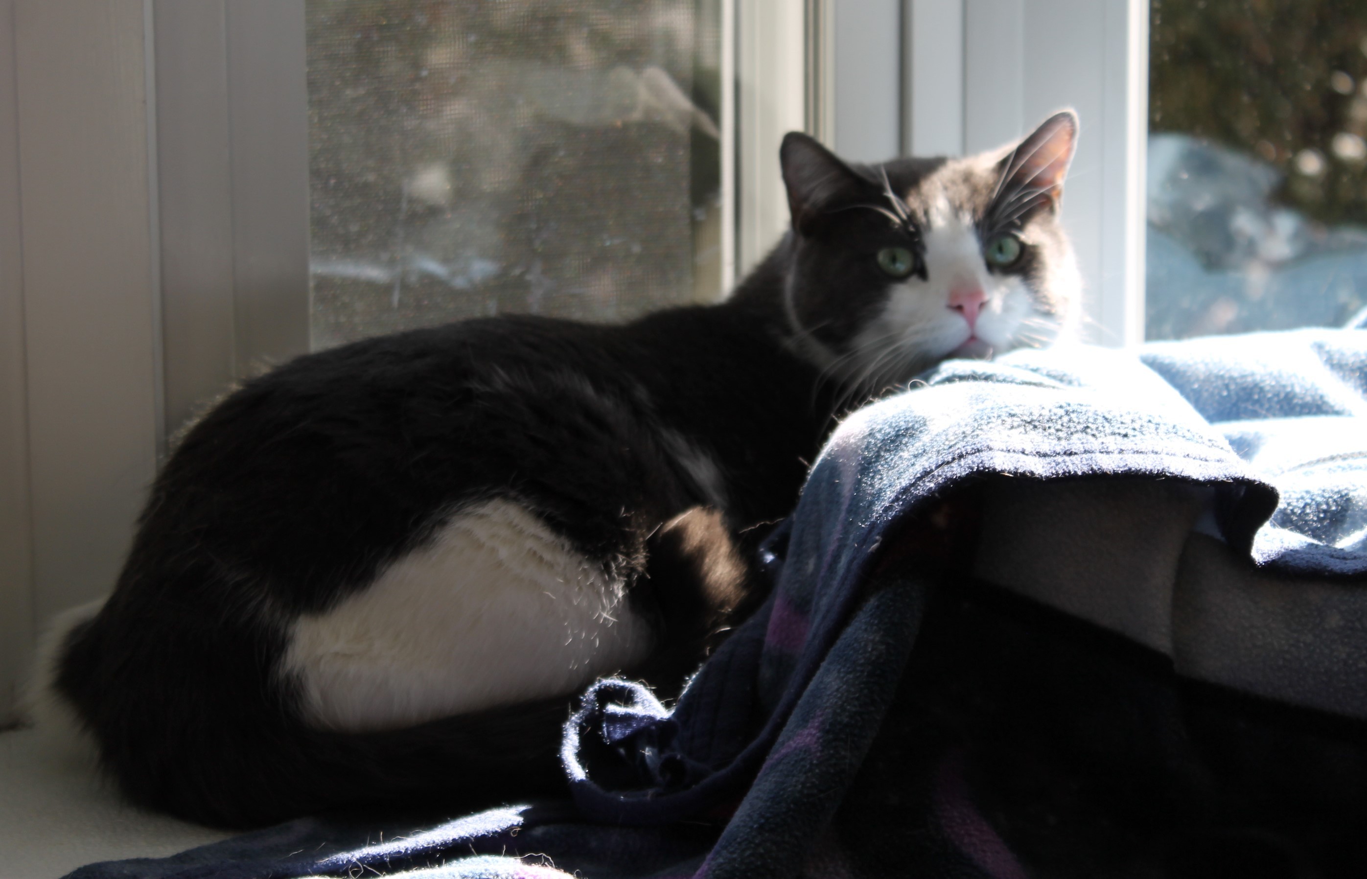 "Sammie the little tuxedo is catching up on her beauty sleep. She was found on a busy street in Mt. Vernon. She was emaciated, and starving for both food and human attention. Sammie is probably about 11 months old (as of 8/6/16). She’s petite and very lady-like. She is not too fond of cats though. Life on the streets is hard. Cats like little Sammie rarely win the battle for food and shelter. Sammie’s old neighborhood is loaded with abandoned cats and kittens. Today, Sammie is a happy, super-sweet and extremely affectionate. All she wants to do is be with people. She’s like a beacon; finding Sammie means finding the rest of the family too. By day Sammie will sit by your feet, on your computer or wait by the front door for your arrival. Evening time includes a good, long rest on your bed. Sammie needs to be in a single cat household. If you can give this deserving cat a few catnip toys and a home please email Ellen at ellenmaher@msn.com."