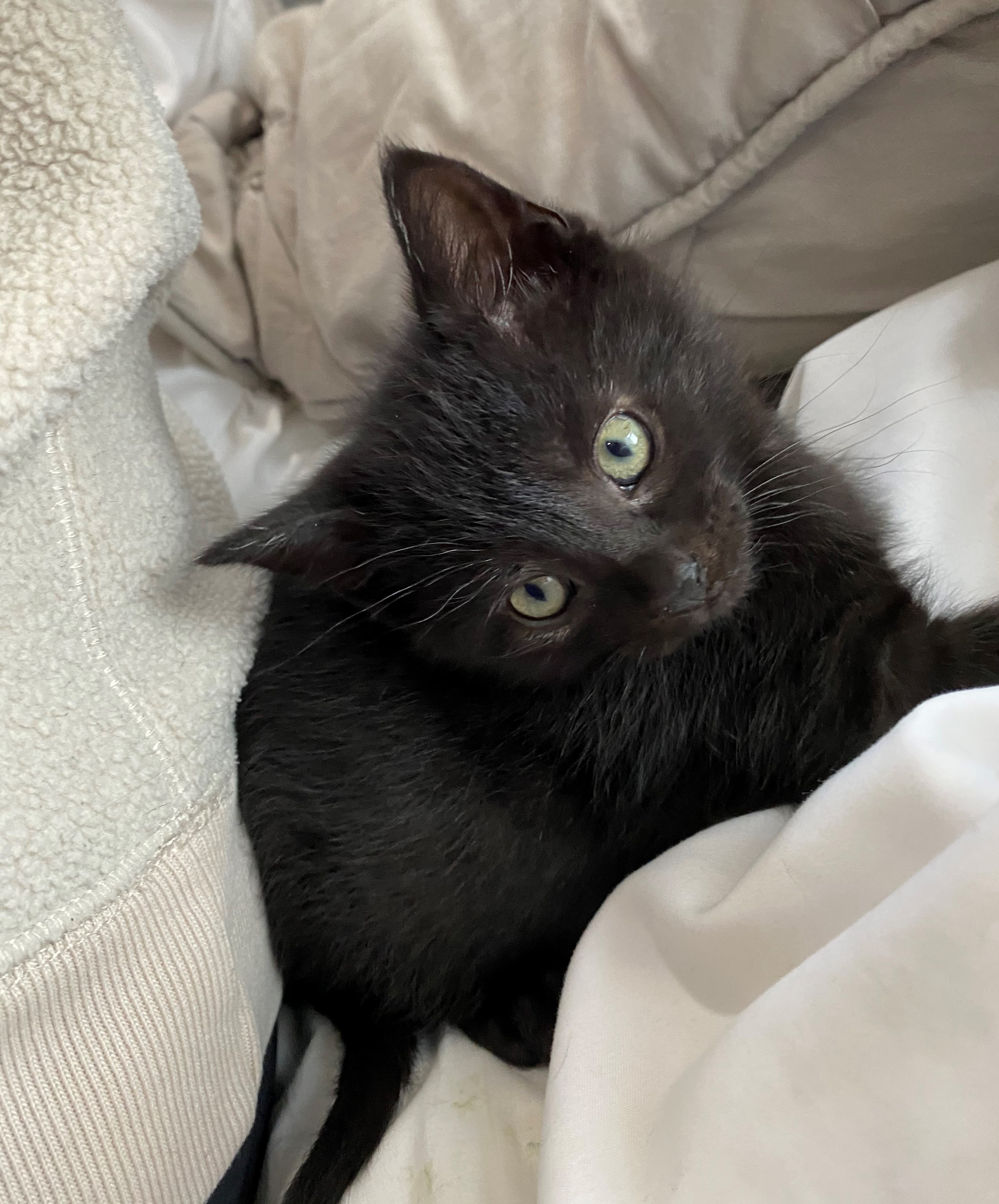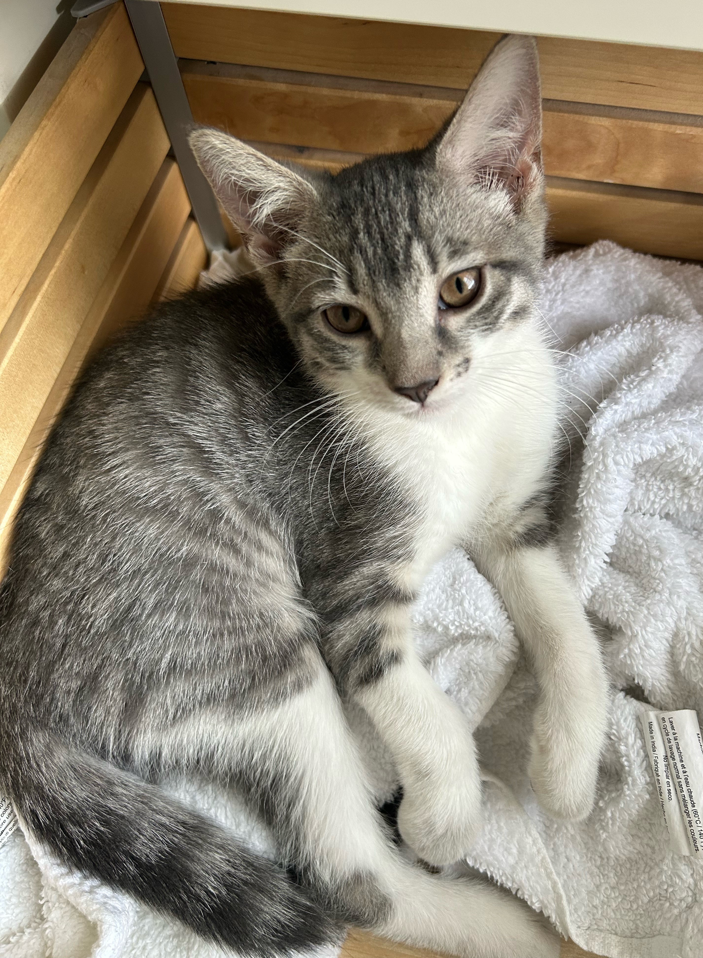 Born May 9, 2022 Sylvie is an adorable kitten being fostered with her brother and sisters. Sylvie is the leader of the pack and is the first to do everything. She’s bossy and brave- she’s the only one of the four to walk right up to the vacuum cleaner to try to figure it out rather than hide! If there was ever going to be another cat-riding-a-Roomba video to go viral, Sylvie would be the star. But when she’s done exploring, she loves snuggles and curls up to sleep as close to you as she can. Adopt her and let her show your appliances who’s boss! Sylvie is fine with kids, other cats and a dog.