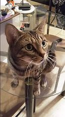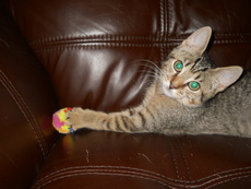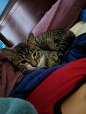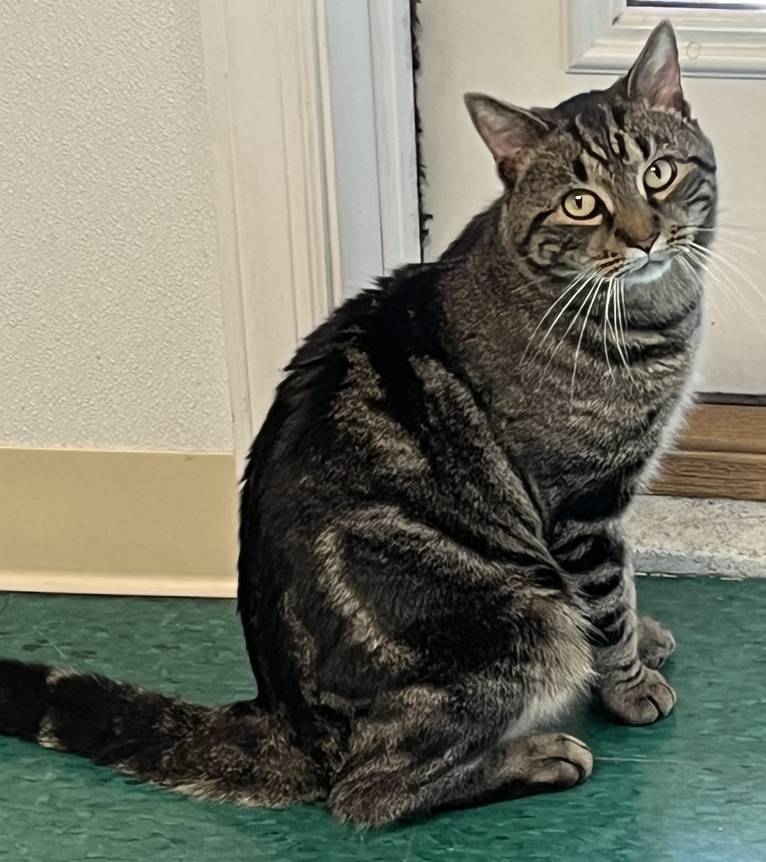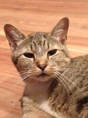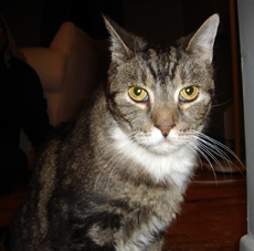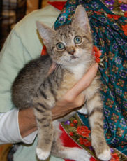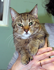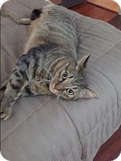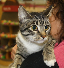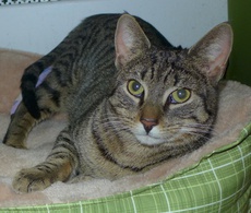Sache is a handsome brown male tabby, about 1 1/2 years old. He has distinctive tabby markings with a little bit of gold thrown in to add to his attractive appearance. This cat is alert, intelligent and very curious. He will make himself at home in a busy or different environment and has a great sense of play.