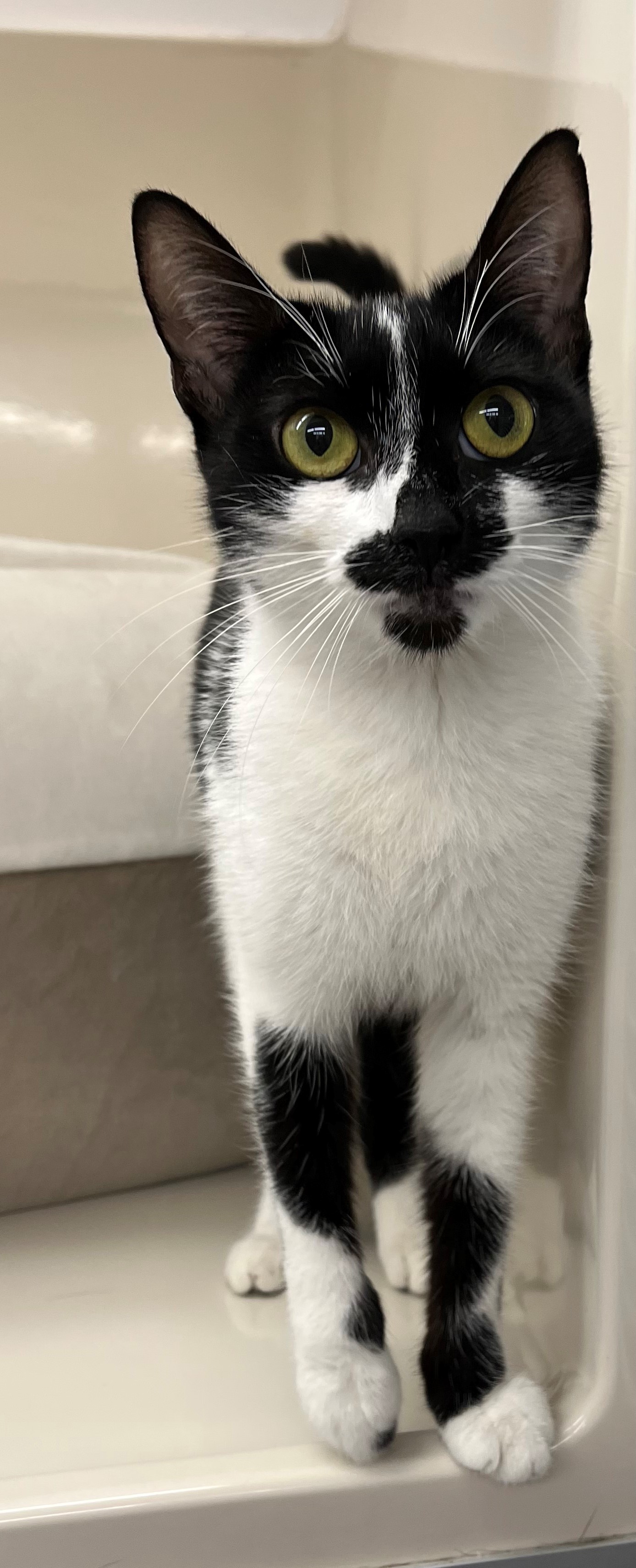 If you have a soft spot in your heart for tuxedo cats, here is Sabrina, and also on the website, her brother, Sam. These 4 month old kittens dash, dart and fly around the house as they enjoy life. Sabrina just sparkles and you can almost see the twinkle in her eye. In good health and up to date with kitten shots, Sabrina is ready for her forever home.