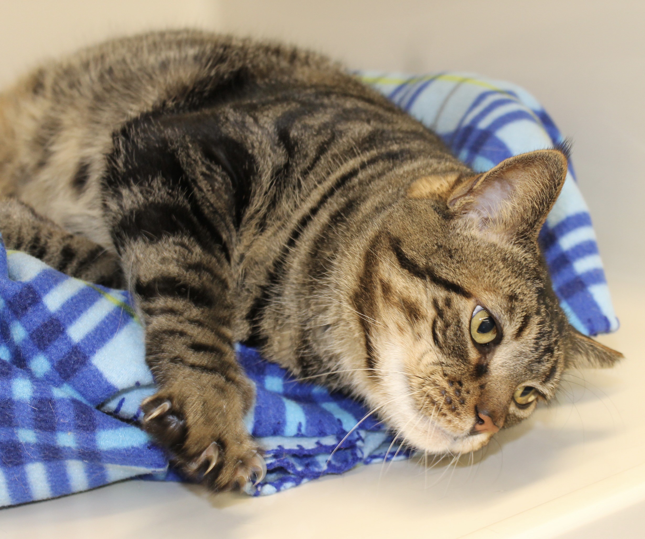 Sunny is a handsome tabby, about 2-3 years old, and one big mush of a guy. This mellow cat would make a fabulous family companion. He loves to be brushed and enjoys human tender loving care. This is one sweet and friendly feline with a very distinctive and striking tabby look.