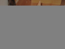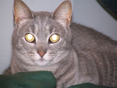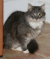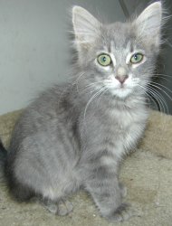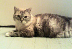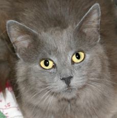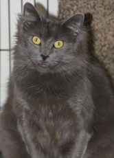Beautiful Sydney is an exotic looking long-haired cat with some Russian Blue, Maine Coon and Siamese in her background. She is both sweet and spunky, friendly, and gorgeous with a fluffy grey mane that looks and feels like velour. This distinctive looking kitty simply must be seen to be genuinely appreciated.