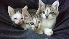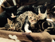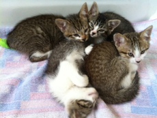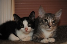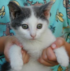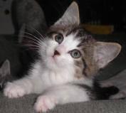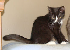 Here come three cute male kitty siblings, all ready for adoption! Bandit is a short hair black and white male with lots of grey on his sleek body. He is a very curious little boy and loves to get into everything. He is also playful and more independent and adventurous than his other siblings. Frankie is a mid-length black and white male, a bit smaller than his siblings and the shyest of the bunch. But our Frankie loves to explore and is full of kittenish playfulness. Ton is the short haired grey and white male. He is playful and curious and very affectionate. Ton likes to sleep in bed with his foster Mom, as do his siblings. All three kittens get along with each other, as well as with their foster Mom's dog.