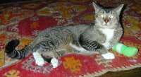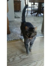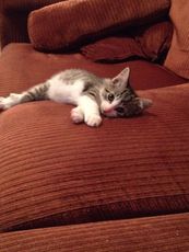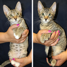 This is one of the most affectionate kittens you can find. You will not regret it if you give this lovely girl a good home. She is great with cats, dogs, bunnies, people, you name it. But she will need a home where nobody can hurt her. She does loose her balance more easily than a regular cat. Also, she is not contagious to other animals. Sabrina is about 4 1/2 months old and 4 lbs. Did I mention that she is a lovebug?