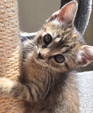 Salome is a cute female "tiger", sibling to Dev and Malachi, also featured on this website. Born on May 3, 2019, Salome is a darling little love who is quick to purr! She and her siblings love their kitty climber, toys with feathers and gentle back scratches (ks).