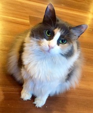 Born July 2020 Samantha has striking markings and thick, silky fur. She is friendly and shows her affection by winding around your legs and nudging you for pets. Samantha is a quiet girl that won't stray far from your side. She'll lounge quietly while you work and wait patiently until you have time to play. Samantha is comfortable with other mild mannered cats but would be happy to have you all to herself.