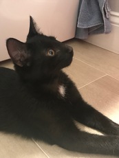 Sam is an AMAZING cat. He loves people, food, being petted, and playing. He loves to be picked up by his human foster sister. He is approximately six months old. Samuel’s foster family would be happy to have you in their home to meet him in person. This cat would make the most incredible addition to any home. He is mostly black with a patch of white on his chest and and tummy.