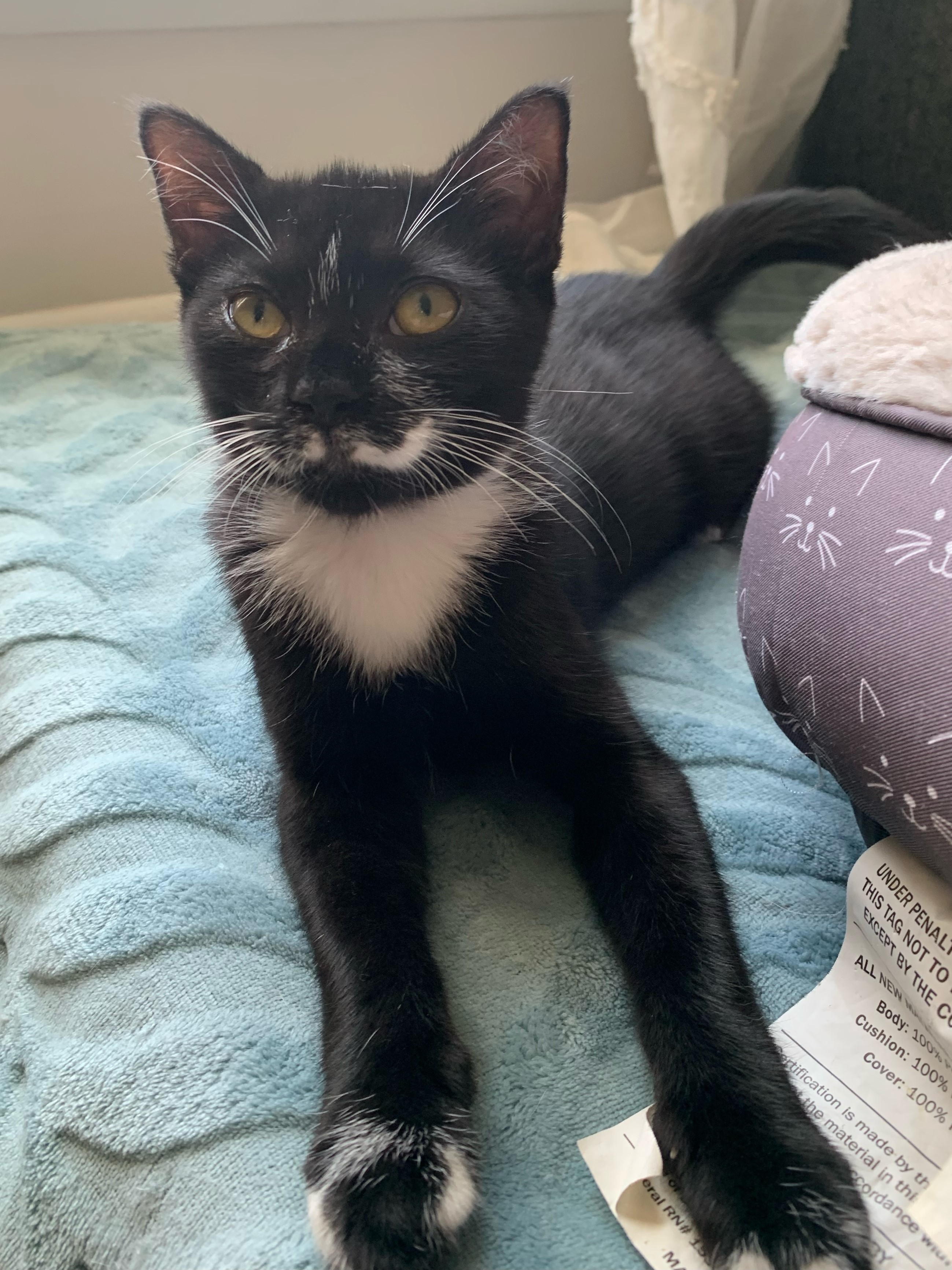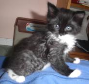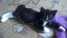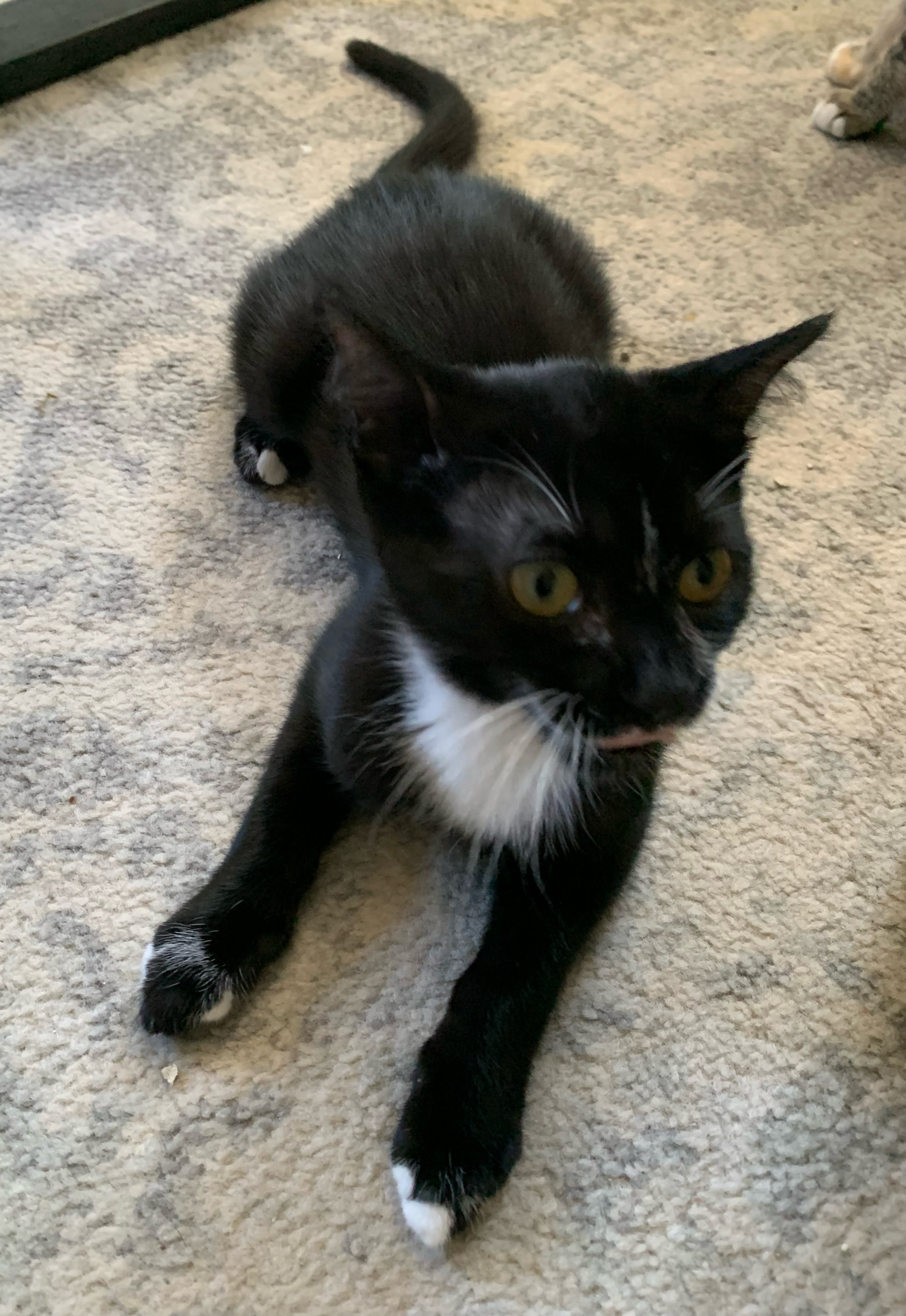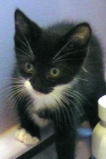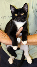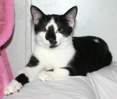 Tucker is a tuxedo kitten, black with a white bib and belly. Born in late April (about 8 weeks old now), he is one of a litter of 5, who loves nothing more than to lie on his back with his paws over his head for a good tummy rub. Tucker is very affectionate and runs to meet you at the door to get back scratches too. He has had his first set of shots and is microchipped.