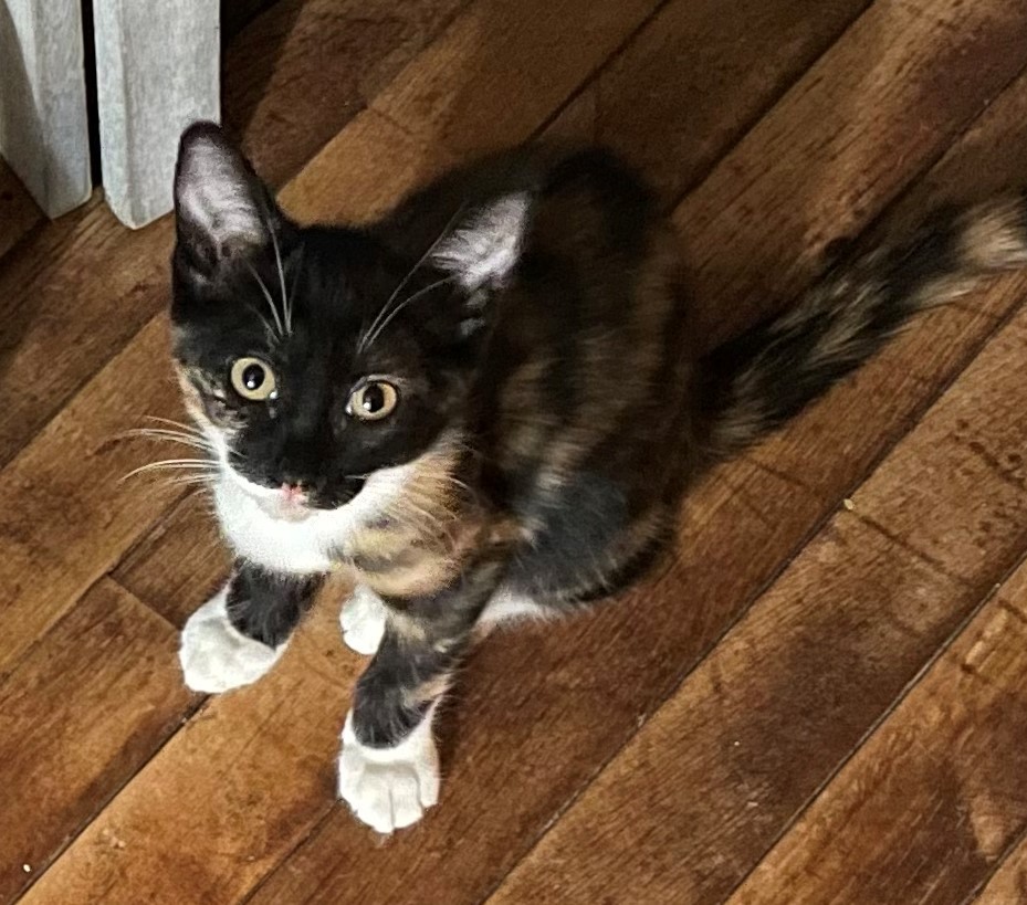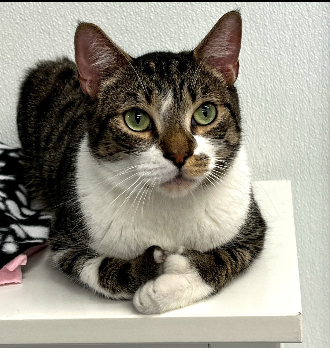 Born January 2021 This beautiful, outgoing little girl would be the perfect addition to any family. She loves attention and is an expert at giving (and receiving) hugs. Trixy is playful but well mannered. She'll never be far from your side, ready to share a cozy chair or enjoy a quick game with a cat toy.
