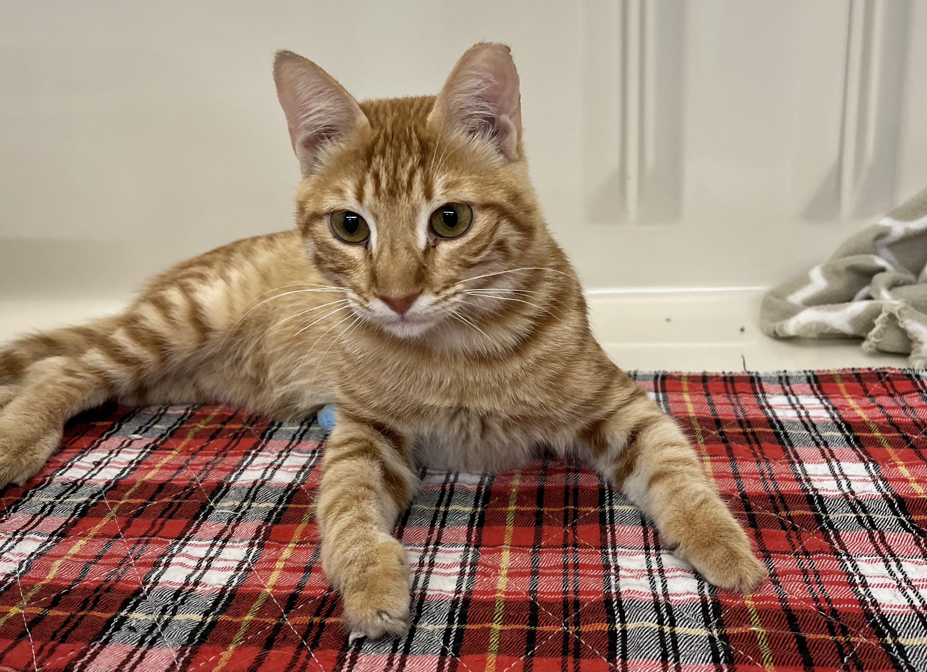 Born May 2023 Tapuz is a friendly, affectionate young cat and a world traveler. He was found near Herod's Gate in Jerusalem with little hope of surviving but this boy has an undeniable spirit. Due to infection and exposure, toes on both his front paws were removed but that hasn't slowed Tapuz down at all. He doesn't have any mobility issues and is an expert at chasing, batting and catching any toy that comes his way. He's an expert cuddler as well! Tapuz is now healthy, safe, warm and ready for a forever home.