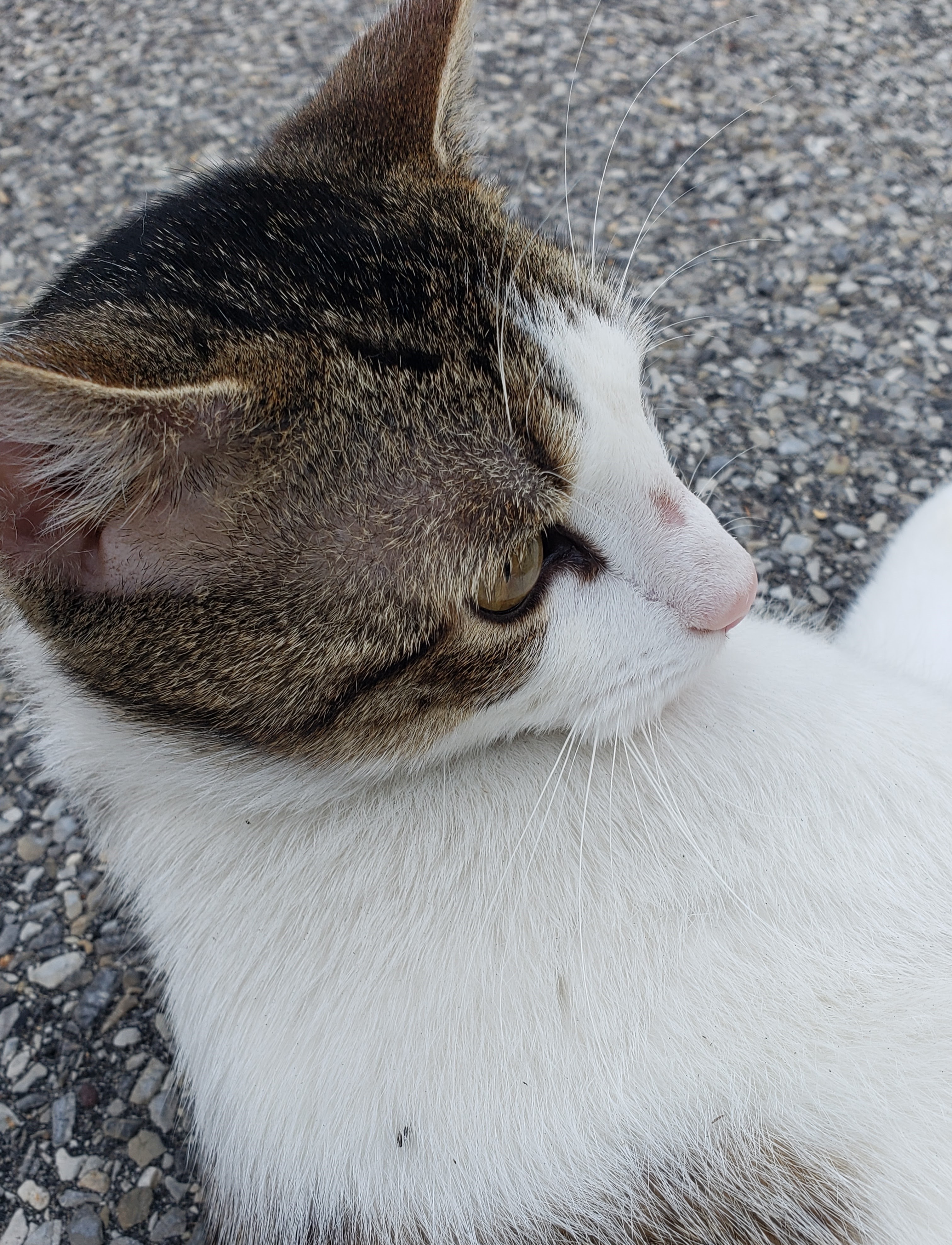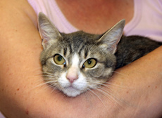 Tabitha (about 1 year old as of 3/15/15) was picked up very thin having sacrificed herself to feed her 4 kittens (listed separately Buzz, Dora, Misty and Zorro). She's extremely friendly and just loves to be held. Tabitha will give nose kisses and stretch out to have her belly rubbed. She's great with other cats, very relaxed and sociable. She'd love to find a home where she can settle on a lap all day and purr.