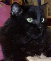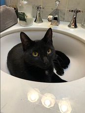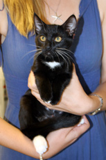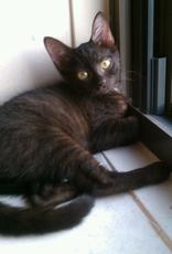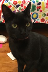 is a young cat that we rescued just a day before she was scheduled to be put down. Her kittens were all adopted and now she deserves a home of her own. She was a fantastic mother and even adopted a sickly kitten as one of her own, helping him to survive. She loves sun-bathing on a window sill and purrs when petted. She's all black with a dot of white under her neck.
