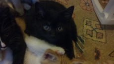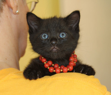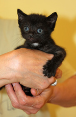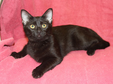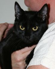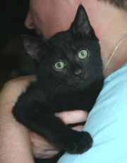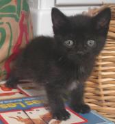 Trooper is an all black boy with little salt sprinkles of white on his back. Born in late April (he's one of 5 in his litter, all posted), he's very playful and affectionate. He's now reached a stage of chasing his own tail in circles until he gets dizzy. Trooper has very soulful eyes that make you want to cuddle him. He has had his first set of shots and is microchipped.