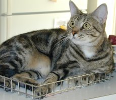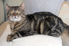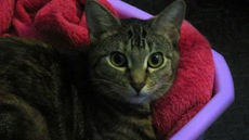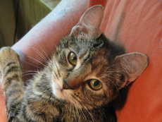 Tabitha is a beautiful, alert 1 1/2-2 year old cat whose litter of four have been adopted. This sweet and loving lady is now spayed (her mothering days are over) and up to date with all shots. She is a delight in the house and can't get enough of belly rubs. She enjoys rolling around on the floor and adores human attention. Not one for highbrow foods (she loves Purina and Friskies), this intelligent, charming cat just needs a permanent home to call her own. To meet Tabitha, please contact her fosterer, Mary Ann, through Pet Rescue.