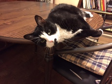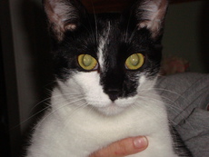 This handsome young boy (approx 9 months) has soft, plush fur and bold markings. One leg is entirely white and the other is black. He spent his young life in a cate is just beginning to enjoy the comforts of a real home. His two favorite places are a comfy cat bed accepting pets or on a window ledge learning about the world outside. This is a curious, playful, independent kitty ready to grow given love and patience. Tux is a healthy eater who has a fondness for "squeezable" cat treats fed to him by his foster mom.