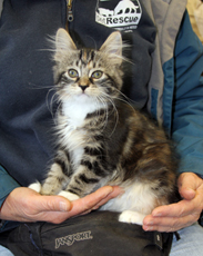 Taffy is a ten week old kitten (10/29/15) and has learned since being rescued from outside at 4 weeks that cuddling is great fun. He came to Pet Rescue with a badly infected eye which had been treated. Taffy has beautiful swirl tabby markings with medium long fur. He is still a bit shy with strangers but loves to play, purr and be petted.