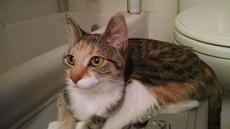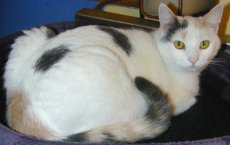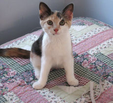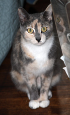 Toshi has perfected nuzzling into an art and she is an ardent lap sitter. We wonder if her wanting to share our breakfast means that she identifies with people so much or that she simply likes oatmeal. In any case, this beautiful pastel calico kitten is a great companion and wonderful to look at. She would be good as an only cat or with others.