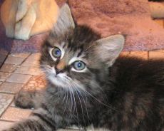 has a very unusual coat. It looks almost black, but is beige underneath. He is soft like a Chinchilla and cuddly like a teddy bear. He is about 8 weeks old and used to other cats, dogs and older children.