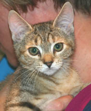 Tammyfae is the only girl in her litter of 5 (all posted on the website) and is the smallest of the bunch. Born in late April, she's a very downy soft gray calico with little patches of orange like her mom. Tammyfae loves snuggling more than eating and curls up under mom's chin while her brothers eat. Tammyfae is very industrious and enjoys tumbling around with her brothers. She has had her first set of shots and is microchipped.