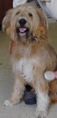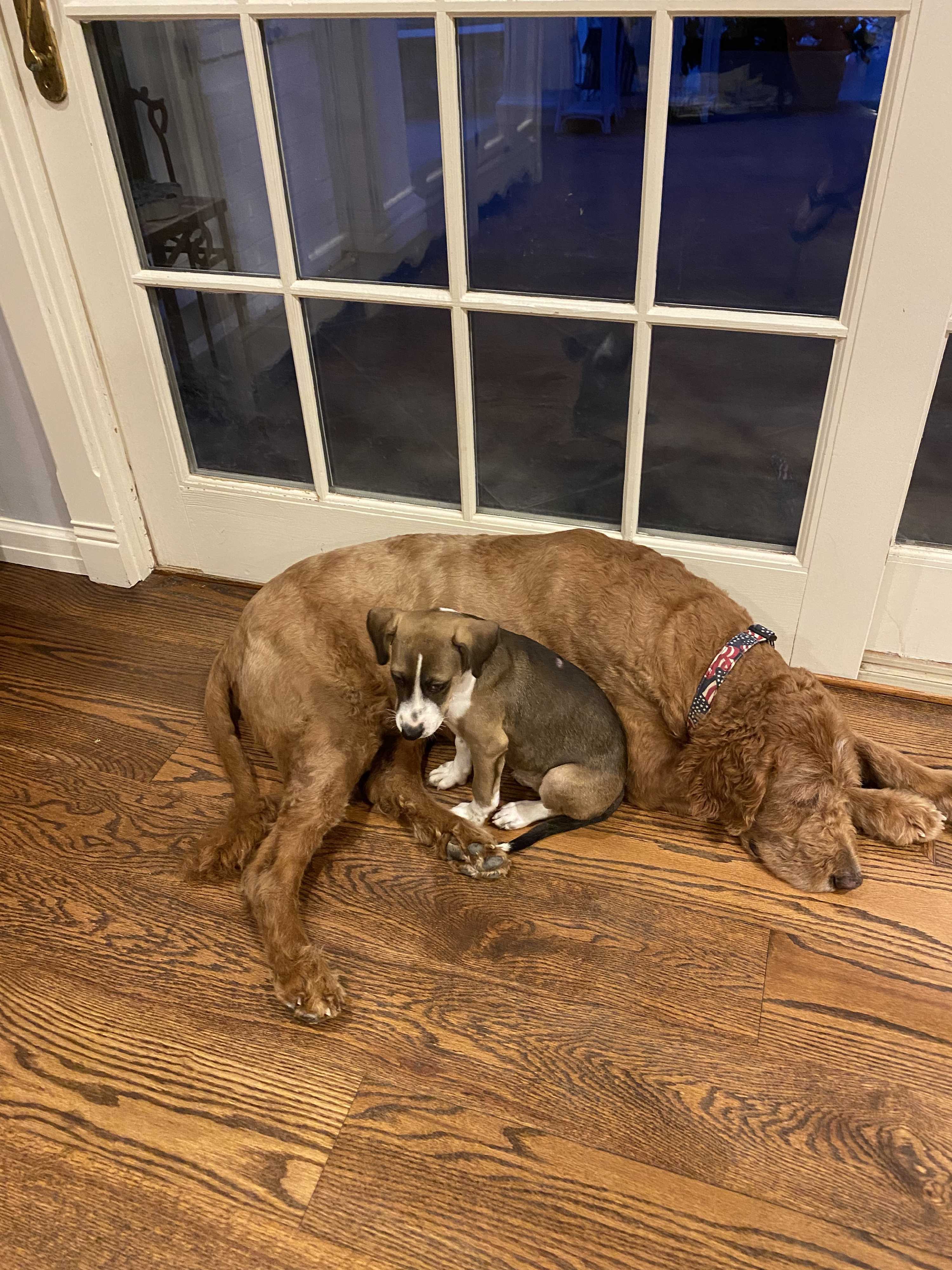 Tucker is an adorable pup, about 14 weeks old and 22 lbs. He is very sweet and friendly. This dog loves affection. If you sit on the floor he is in your lap in seconds, making himself comfortable! We are working on Tucker's housebreaking. He absolutely loves his foster brother Bennie and they play very well together!