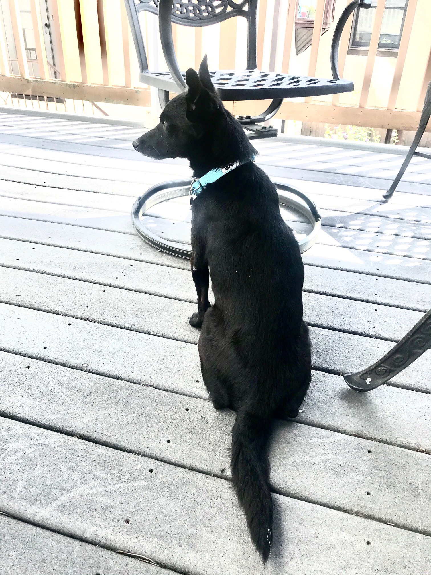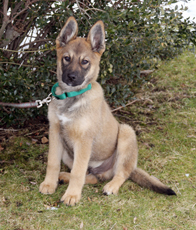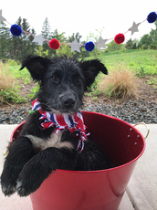 Tucker is the gentles pup I have met. He likes to sit on laps and get cuddled. He is great outdoors and is just starting to play with other dogs. He is very much like a shepherd in that he is very focused on his foster mom and even when he ventures out to play, he comes right back. His ears are in the funny stage between up and down. One seems to have made the transition, but the other one is still trying to get upright. He is nothing but sweet love and great with cats too. He is now about 4 months and around 22 lbs.