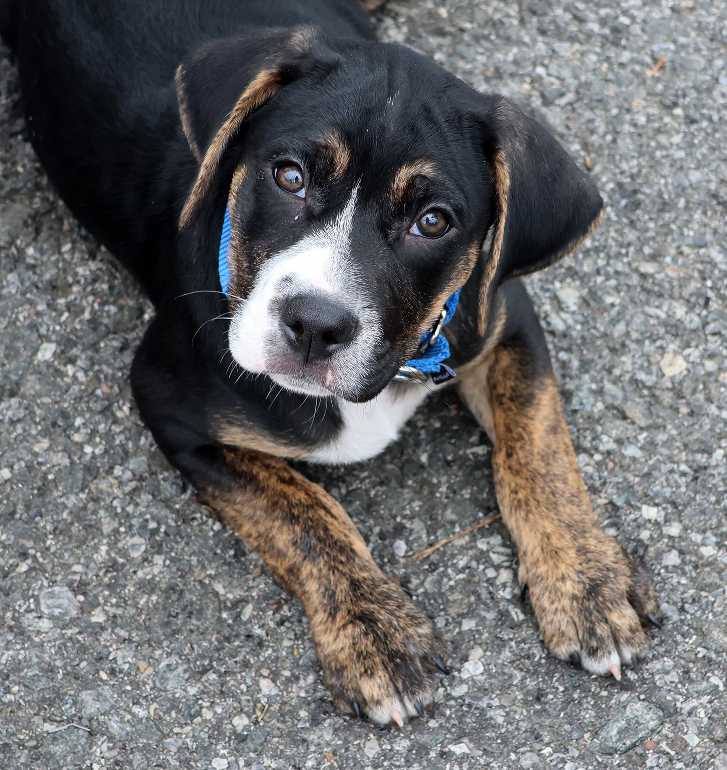 Tammy is a beautiful 50 lb. lab mix with gorgeous markings, expressive eyes and a sweet disposition. She is about 1 year old. She will nuzzle her nose into you and loves to jump on the couch for some cuddling. She sleeps through the night gated in the kitchen without a peep. She is still very much a puppy who needs exercise and some work on basic manners, but she's smart and eager to learn. Because she is still young and excitable, she should go to a family with children under 10 years old. She loves to be around people and another dog at home would be a plus. She needs a fenced in yard or someone who will run and exercise her every day.