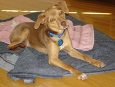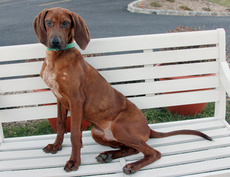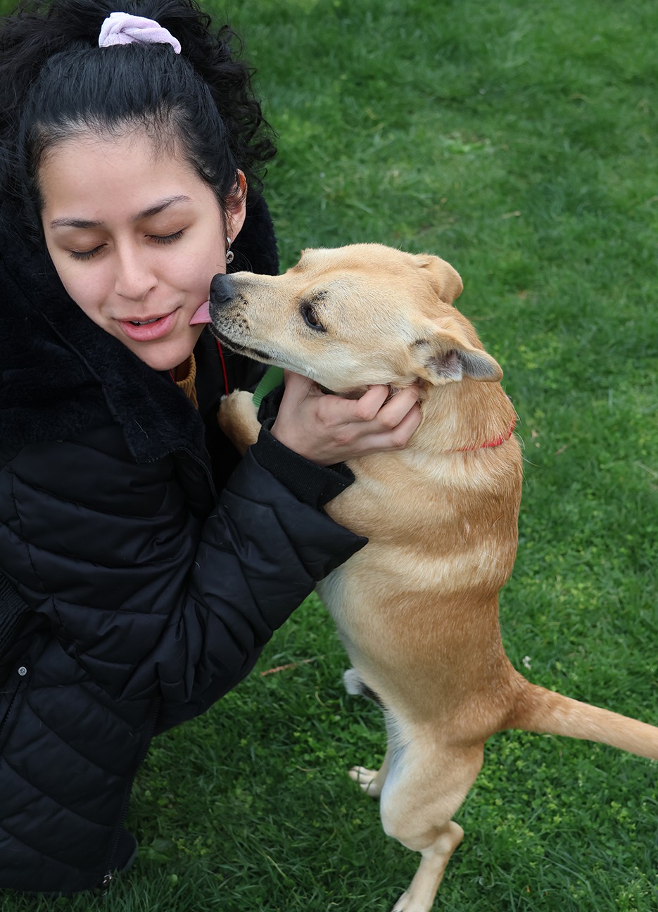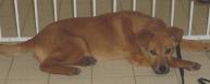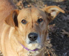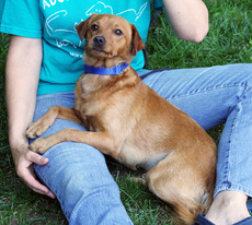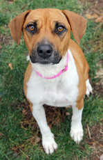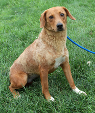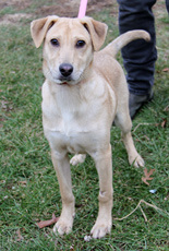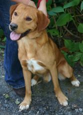 is a gorgeous Lab mix, about 5-6 months old and around 35 lbs. She has a smooth silky coat with reddish highlights. Her sweet face matches her sweet and mellow personality. She will roll over for belly rubs and loves everybody.