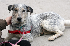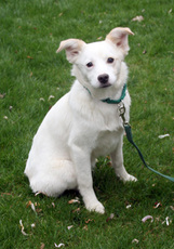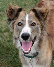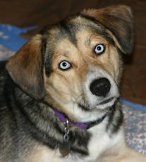 Tangy is an adorable Collie/Aussie mix, about 10 mos old and around 30 lbs. She has a "parti eye" meaning her right eye is part blue and part brown. Housebroken & wonderful with dogs that she plays with at the dog park.