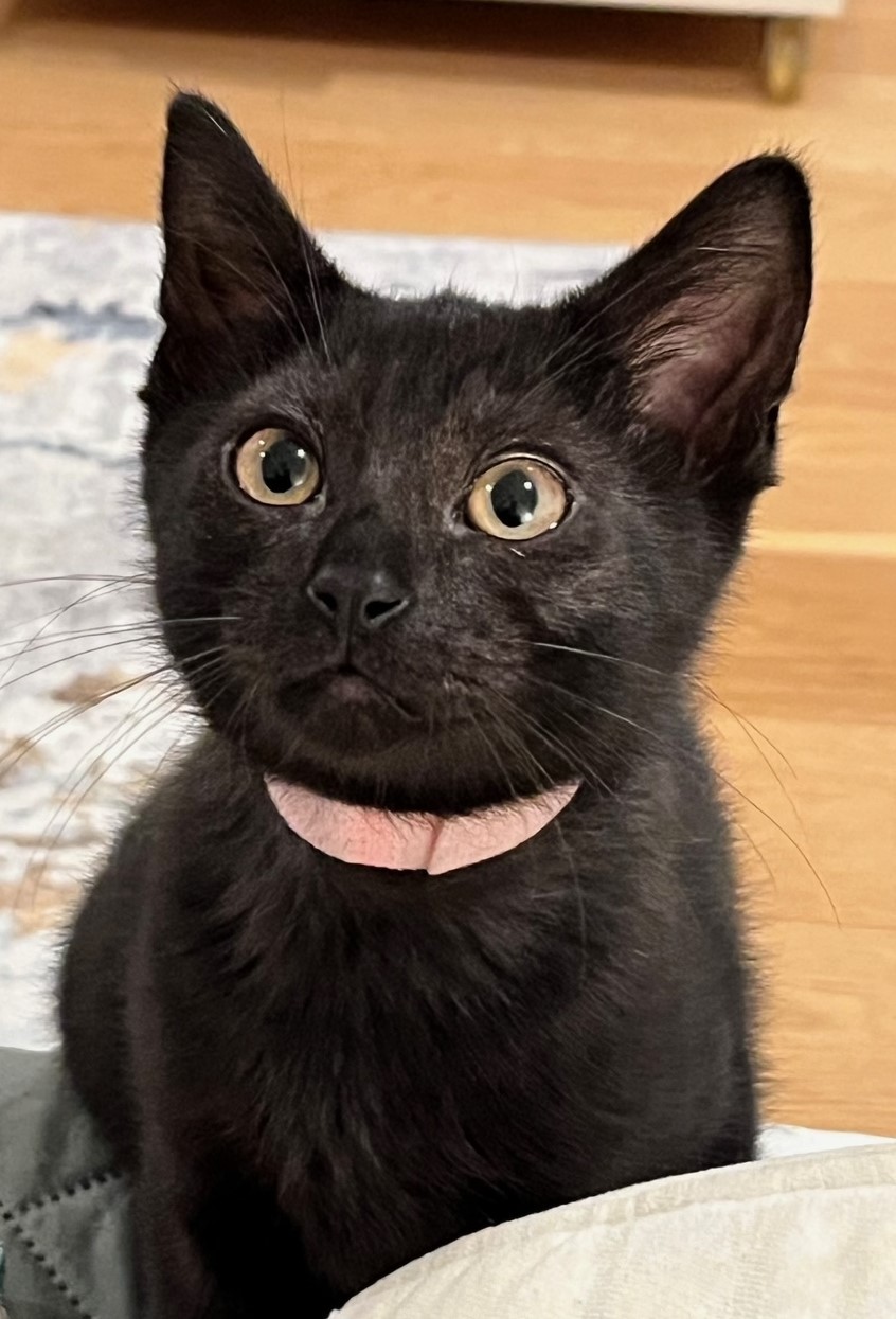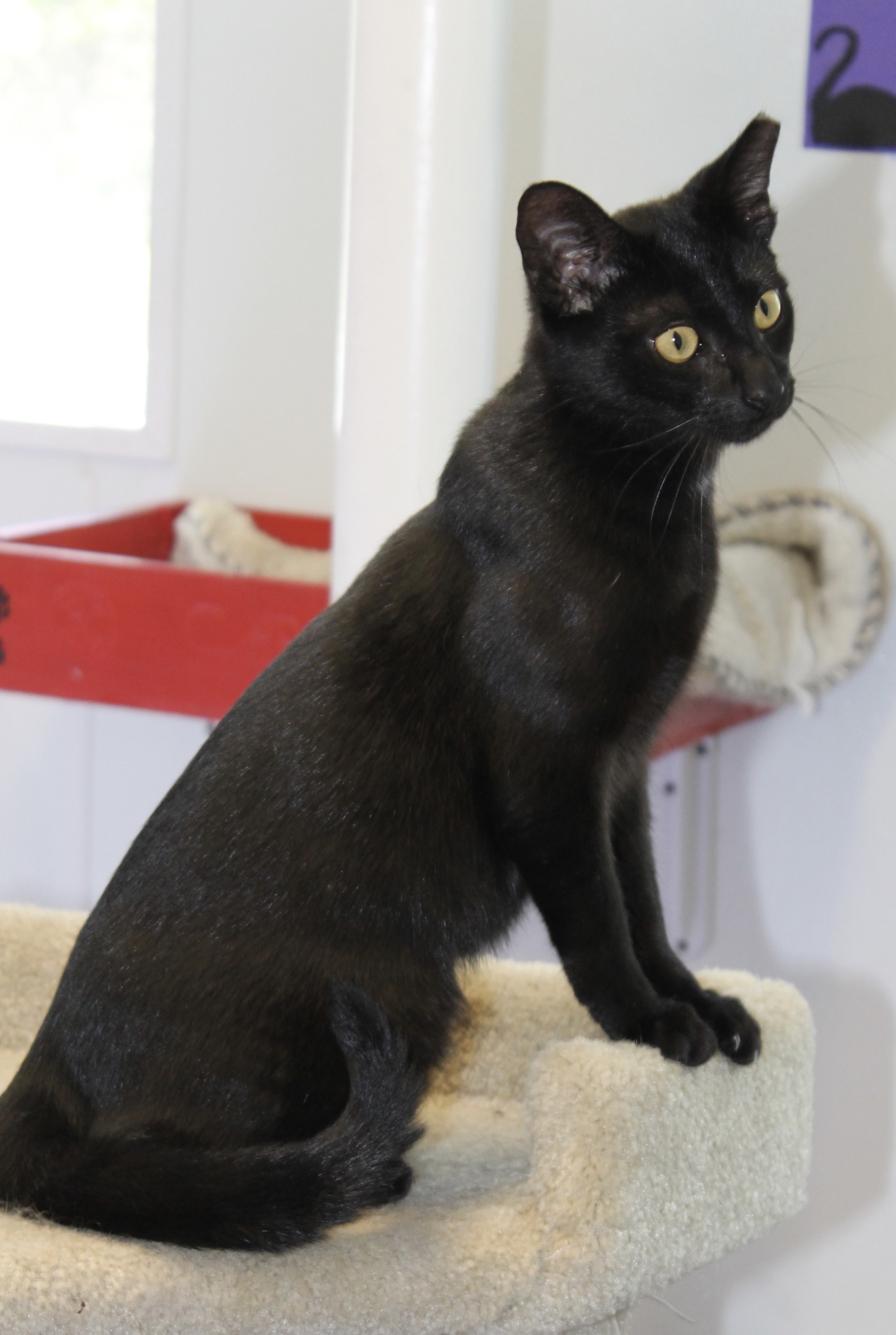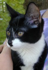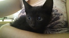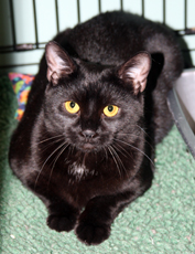 Velvet is everything good: sweet-tempered, affectionate, friendly with other cats and beautiful - her deep black coat almost sparkles. Still smallish, she stretches her lithe little body belly-up when asking to be stroked. Velvet (aka Sonia) is about 7 months old and may grow a little. You will not find a nicer cat.
