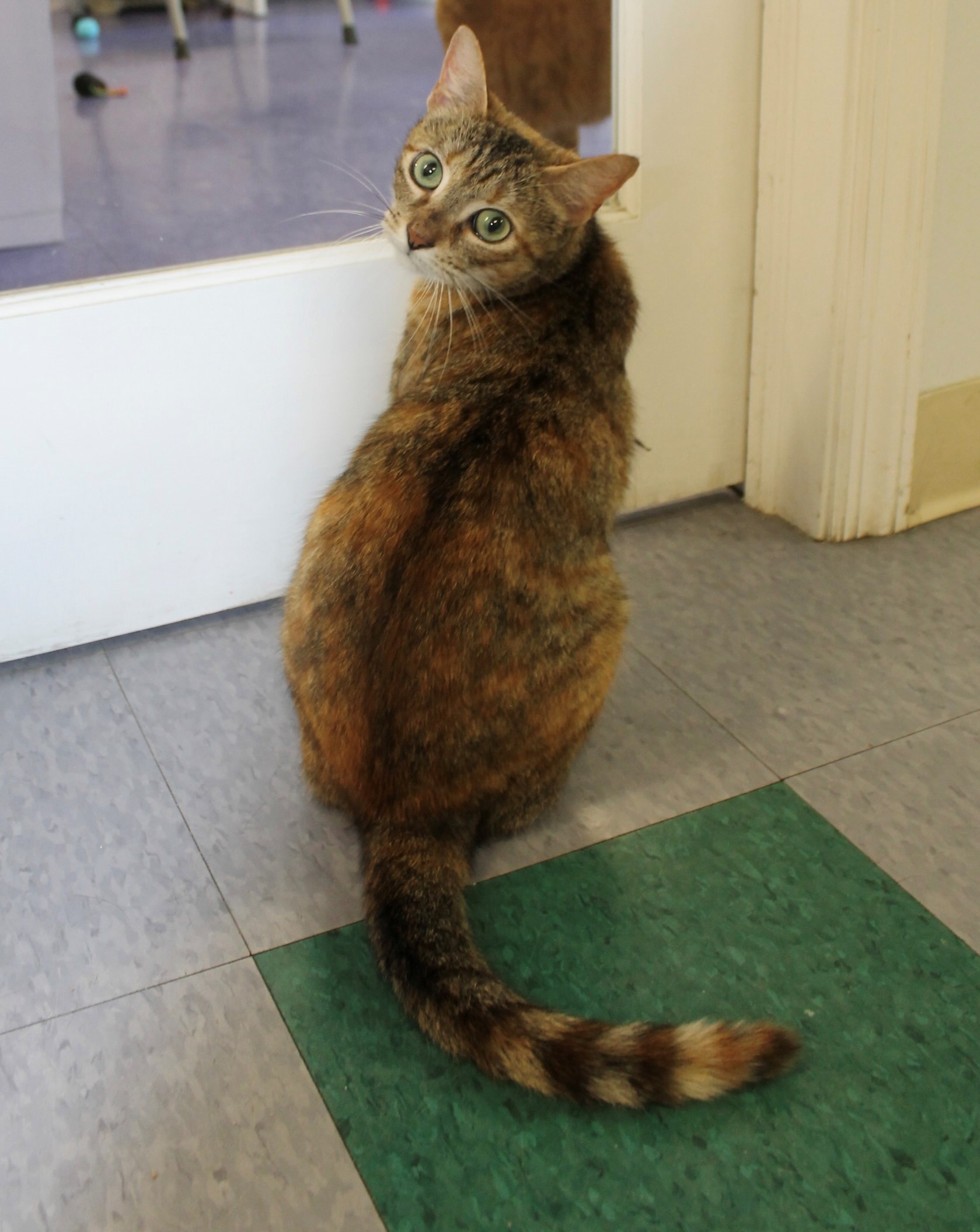 This stunning, green eyed beauty was left on the streets to fend for herself when her owners moved away. She is a classic calico and approximately 2-3 years old. Vivienne is very loving, gentle and affectionate. She makes little peeps to get your attention and will be a great addition to any family. She is EXCELLENT with DOGS.