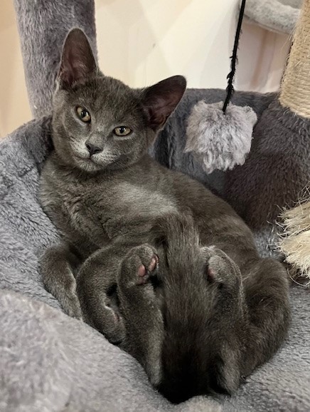 DOB: May 13, 2024 Adoption Pending Meet Vanna with her beautiful grey coat. She is a well-rounded kitten who is intelligent, relaxed but engaged during playtime. She is very affectionate especially during nap time when she appreciates face scratches. She may be a little shy at first but will likely soon warm up to you. She will also place herself right next to you on the bed for cuddles.
