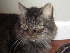 is a gorgeous, blue-eyed Maine Coon mix with luscious, long white fur and gray markings. His owner moved into a senior residence and can no longer care for him. He has all shots, neutered and declawed.
