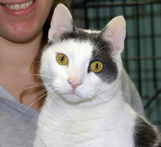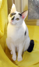 Val is a busybody, exploring every corner and every height. He came from a family of Van cats, a Turkish breed, white with black spots. Val does very nicely with other cats. In his time with Pet Rescue, this elegant cat has gone from being shy to enthusiastically claiming his share of love and attention.
