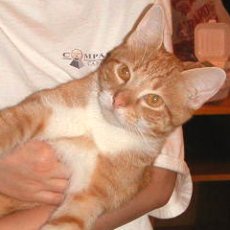 is an orange and white tabby, under a year old. He's extremely affectionate and clean. He loves to sit on your lap and play.