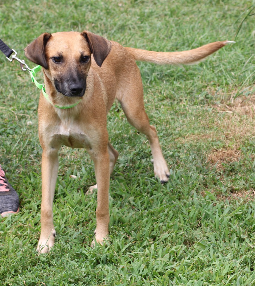 This dainty girl is a lot of fun. She will play and play and then just fall asleep. She is great with other dogs and very well behaved. She will smother you with kisses and relax on the sofa with you. She seems to be a lab/shepherd mix and is around 35 lbs and 1 year old.