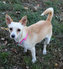 Virginia is a chi-lover's dream. She's small, friendly and a bouncy little bundle of joy. Virginia likes other dogs as long as they are not too rough with her and she gets along with cats too. She is working on her housetraining. She is about 1 year old and around 6 lbs. Because of her tiny size, she is not recommended for families with children under 10 yrs old.