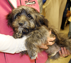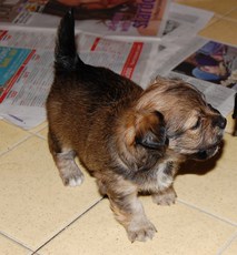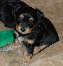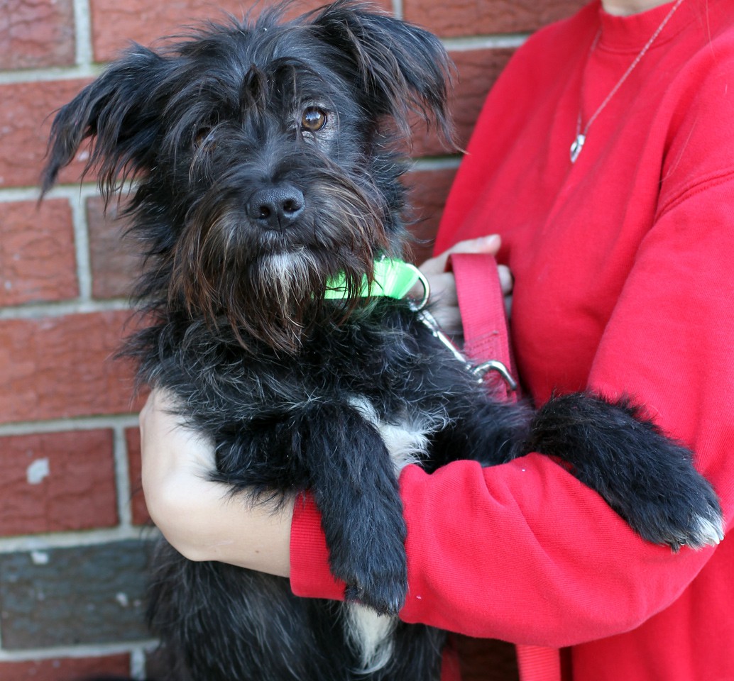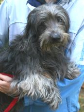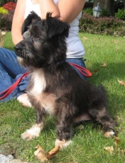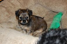 This little pup has too much personality to contain in such a little body! He is about 4 months old and 7 lbs. He would chase his sister (who was adopted) around like mad and now he needs his own home. Wags is very interested in people and will hop around on two legs whenever he gets excited like at play and meal times. He loves to follow his foster mom around the house. He is being fostered with adult dogs. If you keep on a schedule, he will go "do his business" outdoors and will sleep in crate through the night so long as he is in the room with you. (formerly listed as Schnauzer pup) adopted by Farrell Sledd
