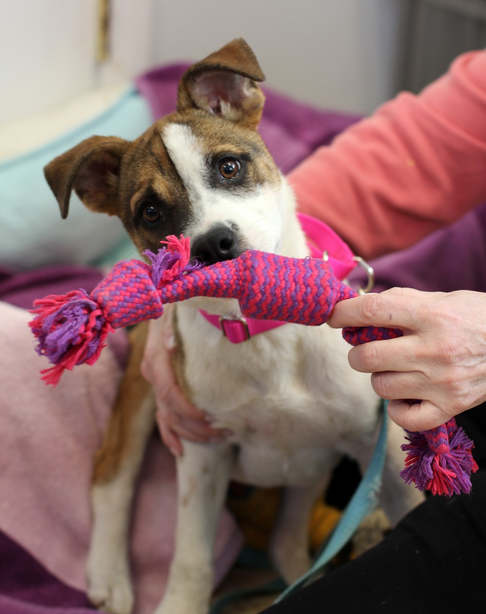 Winnie is a wonderful little girl. She is 7 months and 30lbs. She came to Pet Rescue with her front left leg not working. The vet determined that she would have no use of the leg because of an issue at birth or shortly after. Her leg was amputated two months ago and she has recovered beautifully. She hops around like she never had a fourth leg and is a happy, playful six month old puppy. She loves to play with other dogs, she enjoys her chew toys and follows her foster family all over the house. She's great in the car and sleeps through the night in a dog bed next to her foster mom and she is now housebroken if kept on a schedule. She is a social girl and will do best in a home with another young dog to play with and learn from.