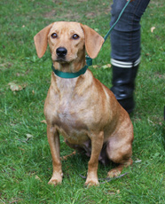 Wheat is an adorable lab/beagle mix, about 1 1/2 years old and 28 lbs. She is a beautiful, gentle girl whose name should really be "sweet." She is a real cuddler and very calm, very friendly to all and especially great with kids. Wheat is a bit strong on the leash, but is responding well to training. Wheat loves her people and will try to protect them if a strange dog approaches. She is sweet to every single person she meets. Her color is striking and her face extremely expressive. She is very affectionate and has the softest fur. Wheat should not be in a home with cats.