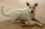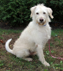 is about 1 year old and very sweet. He is a beautiful off white color and only about 29 lbs. He is house broken and loves to play. He loves other pets (cats & dogs) and is very calm too. Litte shy initially but bonds very quickly. A very happy dog! Loves to be with people and wants to please.