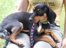 is a regal, pure breed Dachshund, about 1 1/2 years old and 14 lbs. He is just beautiful with a dappled coat . He is very friendly and sweet. Loves to sit on your lap, give kisses and get his belly rubbed. Gets along well with other dogs. Just a great boy! Please fill out an adoption application.
