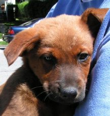 is a happy puppy, about 3-4 months old and 15 lbs. If you look close, you can see his right eye has a little blue in it. His foster mom says "He is very sweet and gentle. He likes other dogs and is neither aggressive nor submissive --he's very easy going and friendly, but isn't a jumper. He also has no nipping tendencies. Loves to play and chase butterflies, but content to sleep next to her chair when Mom's on the computer. He also likes to ride in my convertible." Please fill out an adoption application.